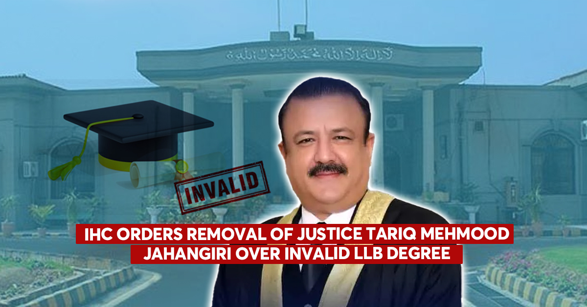 The Islamabad High Court (IHC) on Thursday ordered the removal of Justice Tariq Mehmood Jahangiri from his position, ruling that he was not legally eligible for appointment as a high court judge due to holding an invalid Bachelor of Laws (LLB) degree.