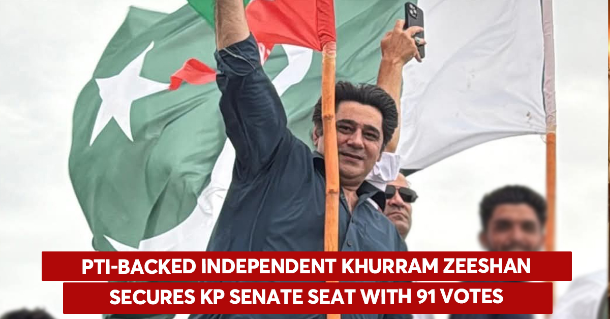 PTI-backed independent candidate Khurram Zeeshan has been elected as a senator on the general seat from Khyber Pakhtunkhwa (KP). The seat became vacant after the disqualification of PTI leader Shibli Faraz, who was serving as the opposition leader in the Senate before being convicted in cases related to the May 9, 2023 incidents.